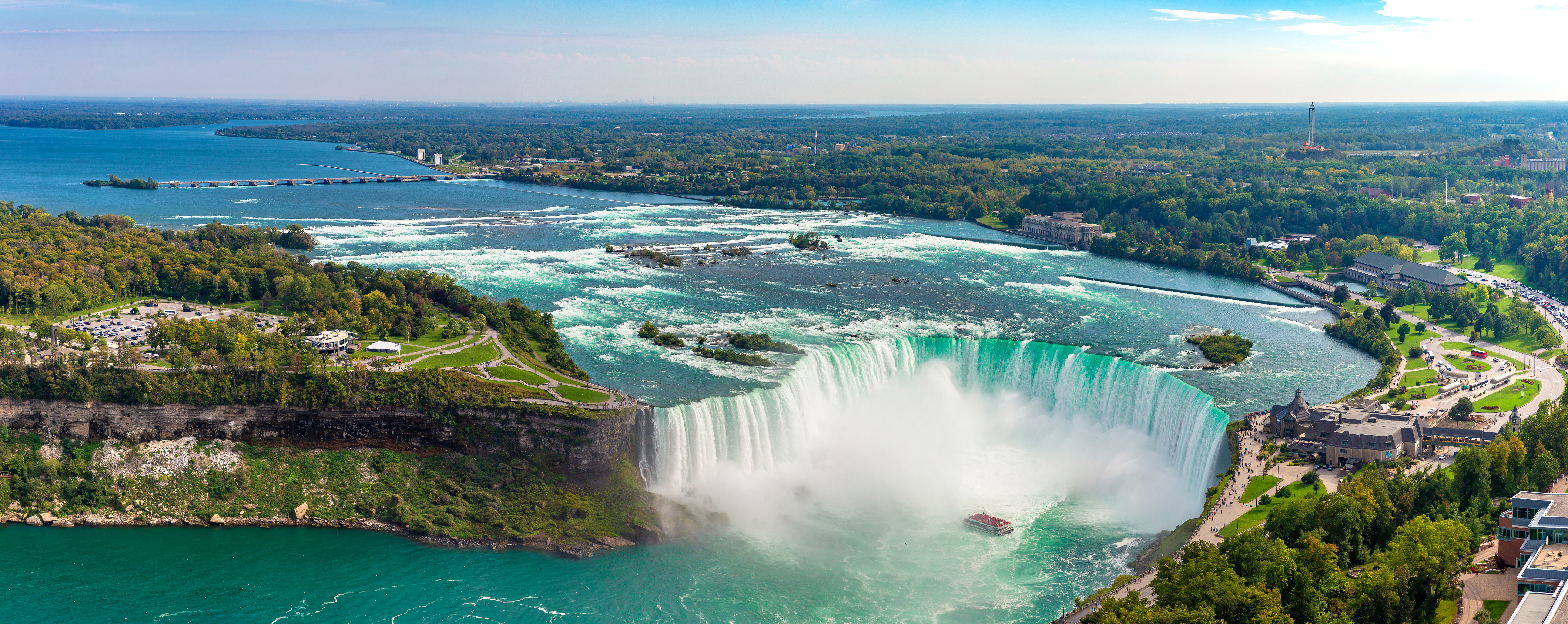 Panorama of aerial view of Canadian side view of Niagara Falls, Horseshoe Falls in a sunny day in Niagara Falls, Ontario, Canada